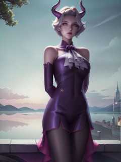 1 girl,horns,dress,arms behind back,cityscape,lake,night,sitting, yellow eyes, short hair,  <lora:milaidi_20230703182517-000012:0.8,>,ascot,