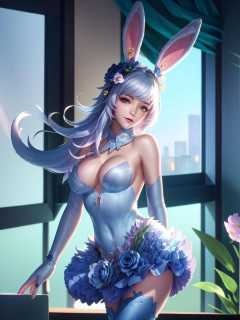 hair ornament,skirt,elbow gloves,looking at viewer,cityscape,night,indoors,window,lake,table,arms behind back,legwear,blue rose,hair flower,rabbit ears, flower skirt,standing, <lora:gongsunlihuajianwu_20230706001822-000010:0.8>,playboy bunny,