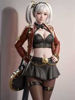 hair ornament, looking at viewer, miniskirt, bow, twintails, jacket, pantyhose, standing, arms behind back, belt,ribbon, thigh strap, hair bow, bowtie,navel, <lora:shenpanzhe_20230707112857:0.75>,white hair, short hair, gold chain, red jacket,