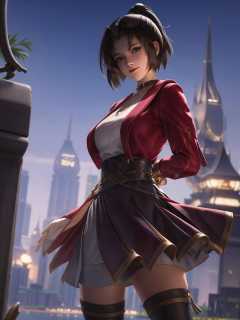1girl, short hair, standing, cityscape, night, lake,looking at viewer, mature female, arms behind back, ponytail, hair ornament,belt,skirt,boots,  <lora:yunying_20230706143836-000020:0.8>,jacket,