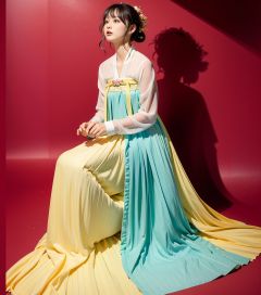 masterpiece, best quality,realistic, (color palette (background)), 1girl, (hanfu, tang style outfits, upper shan, chest pleated skirt)