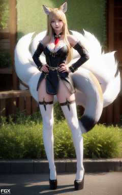 best quality,masterpiece,highres,cg,1girl, animal ears, tail, fox ears, solo, fox tail, breasts, thighhighs, blonde hair, multiple tails, high heels, large breasts, heart, long hair, hand on hip, cleavage, black thighhighs, looking at viewer, bare shoulders, facial mark, dress, whisker markings, fingernails, underwear, alternate costume, fox girl, full body,lighting,candid,Photograph,high resolution,4k,8k,Bokeh,