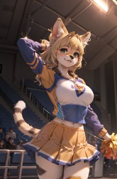 masterpiece, best quality,hdr,8k,1girl,furry femalesolo,(high detail fur:1.2),cinema angle,8K,game CG,after performperfect lighting,servalcat,Cheerleading uniform,looking at viewer,blonde<lora:servalcat:0.7>  <lora:kenkelly:0.5>