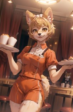 masterpiece, best quality,hdr,8k,1girl,furry female,persona dancing, solo,(high detail fur:1.2),cinema angle,8K,game CGperfect lighting,servalcat,(waiter orange uniform:1.1),looking at viewer,blonde<lora:servalcat:0.7> <lora:add_detail:0.35> <lora:EnvyBeautyMix37:0.5>