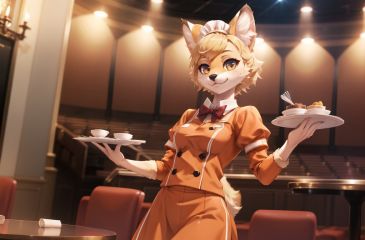 masterpiece, best quality,hdr,8k,1girl,furry female,persona dancing, solo,(high detail fur:1.2),cinema angle,8K,game CG,after performperfect lighting,servalcat,(waiter orange uniform:1.1),looking at viewer,blonde<lora:servalcat:0.7>