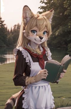 solo,masterpiece, 8k,best quality ,furry girl,8k,hdr,hires,high detail fur,outdoors,servalcat,holding_bookperfect anatomy,blonde,long hair,look at looking at viewer,(white apron:1.1),red neckchief<hypernet:furry_kemono:0.3> <lora:servalcat:0.7> <lora:sovietForm:0.5>