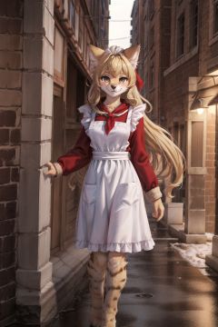 solo,masterpiece, 8k,best quality ,furry girl,8k,hdr,hires,high detail furoutdoors,building,square,winter,red flag,servalcatperfect anatomy,blonde,long hair,look at looking at viewer,(white apron:1.1),red neckchief <lora:servalcat:0.7> <lora:sovietForm:0.5> <lora:add_detail:0.5>