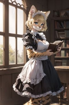 masterpiece, best quality,4k,hdr,good_quality,furry girl,reading book,blonde,servalcat,side of windows,perfect light,dynamic pose, ,kitten,adorable,maid dresss, looking at viewer,<lora:servalcat:0.7>