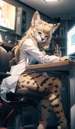masterpiece, best quality,hdr,8k,furry girlobsolete computer center,wired retro machine,gloom day(masterpiece, best quality, ultra detailed, absurdres), legs lie on desksolo,high detail fur,cinema angle,8K,game CG,screen light,rim lightperfect lighting,servalcat,Laboratory coat,looking at screen,blonde,long hair,<lora:servalcat:0.7> <lora:add_detail:0.3>