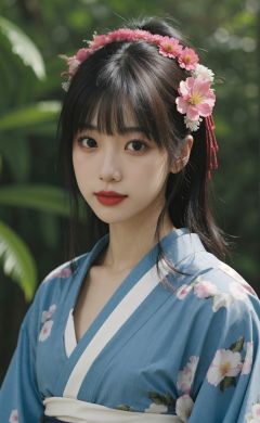 <lora:FilmVelvia3:0.6>, 1girl, solo, outdoor, cute japanese model girl, kimono, floral print, hair ornament, looking at viewer, hair flower, brown eyes, bangs, masterpiece, best quality, realistic