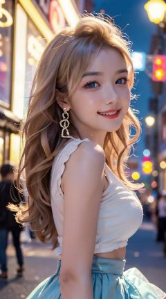 1girl,solo,gold hair,portrait,earrings,jewelry,looking at viewer,realistic,blue eyes,long hair,crazy laugh,cowboy shot,Shopping Street,(Night),((neon trim)),neon lights,complete with a full skirt and petticoat,and neon signs. Her eyes should be sparkling with excitement,her skin flawless and glowing under the soft,dramatic lighting. This scene should be captured on 35mm film,with a beautiful depth of field and a slightly blurry,nostalgic background. film portrait photography,35mm film,filmg,<lora:Asianface_v1.0:0.7>,