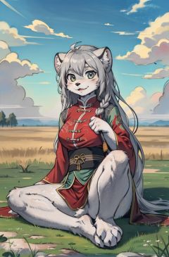 masterpiece, best quality,(furry girl:1.3)hdr,8k,hires,extremely detailed CG unity 8k wallpaper,prairie,manul,tusunillustration,absurdres,traditional media,grey hair ,long hair,looking at viewer,cloudy sky ,chinese clothes, outdoors,paws,<lora:Manul:0.7><lora:EnvyBeautyMix25:0.5>