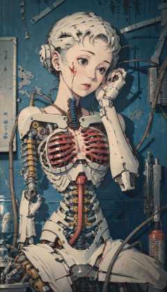 <lora:Ukiyo-e:0.6>, ukiyo-e, (((masterpiece))), (((best quality))), ((ultra-detailed)), (highly detailed CG illustration), ((an extremely delicate and beautiful)),(cute delicate face),cinematic light,((1mechanical girl)),solo,full body,(machine made joints:1.4),((machanical limbs)),(explosed muscles),(blood vessels connected to tubes),(a brain in container:1.3),((mechanical vertebra attaching to back)),((mechanical cervial attaching to neck)),((sitting)),expressionless,(wires and cables attaching to head and body:1.5),small breasts,short hair,(character focus),science fiction