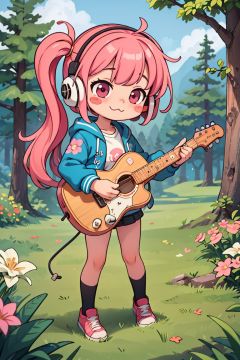 masterpiece,best quality,1 chibi girl very cute with pink hair and blushed, flower, outdoors, playing guitar, music, holding guitar, jacket, :3, shirt, long pinkhair in one side ponytail, pine trees, pink hair, blush stickers, long sleeves, bangs, headphones, flowers,<lyco:GoodHands-beta2:1.0> <lora:more_details:0.3>,