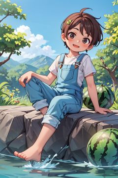 masterpiece,best quality,(more Cut Watermelon:1.2), overalls, white shirt, (1boy:1.2), sitting on rock, barefoot,leaning back, two Feet in the water,head tilt, happy, (looking at viewer:1.2), sky,forest, river, very short hair, brown hair,,<lyco:GoodHands-beta2:1.0> <lora:more_details:0.3>,