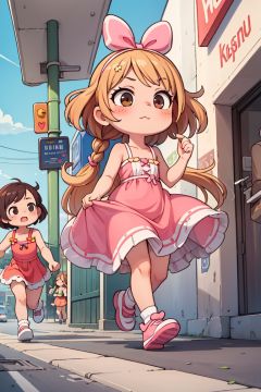 ((best quality, masterpiece)), dramatic, 2girls , running, blonde girl and brown hair girl,pink (((kawaii))) sundress, street, crowd, <lyco:GoodHands-beta2:1.0> <lora:more_details:0.3>,