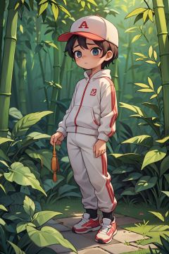 ((best quality, masterpiece)), dramatic, This is a very cute one wearing a cap, 1boy,wearing a tracksuit,bamboo forest background,, <lyco:GoodHands-beta2:1.0> <lora:more_details:0.3>,