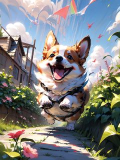 Master works, high quality, film quality, a dog, corgi, flying in the sky, with sun goggles, clouds, rainbows, wings,MG keji,solo,, <lora:EMS-5749-EMS:1>