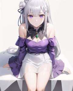 best quality,highly detailed,masterpiece,ultra-detailed,1girl,(white background),simple background,Delicate eyes,emilia_\(re:zero\),silver hair, purple eyes,hair_ornament,(off-shoulder shirt:1.3),long hair,pointy_ears,crown_braid,expressionless,Straight hair,(++sitting:1.2),