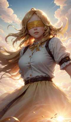 golden-blindfold, masterpiece,best quality,movie still,1girl,cloud girl,floating in the sky,close-up,bright,happy,warm soft lighting,sunset,(sparks:0.7), <lora:YKHB-000000:0.6>