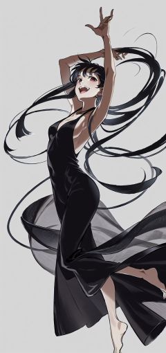 by yoneyama mai, 1girl, solo, red eyes, dress, white background, breasts, black dress, barefoot, long hair, simple background, sideboob, black hair, open mouth, full body, arms up, teeth