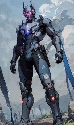 1man,<lora:ag-nobg:1>,dark suit,glowing eyes,standing on ground,outdoors,blue sky,cloud horizon