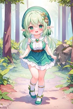 masterpiece,high quality,1girl,(solo:1.2),open mouth,happy,looking at viewer,long hair,large breasts,standing,green hair,elf,forest,magic,(loli:1.2),(child:1.2),full body,, <lora:EMS-5300-EMS:1>