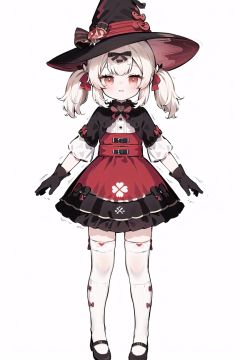 (8k, best quality, masterpiece), (ultra-detailed:1.1), (high detailed skin), full body, <lora:klee_v1:0.65:char>, kleenew, loli, child, red_dress, witch hat, black_gloves, twintails, bow, clover print, hat ornament, kneehighs,sidelocks, (white background, simple background:1.4), (black outline:1.2),