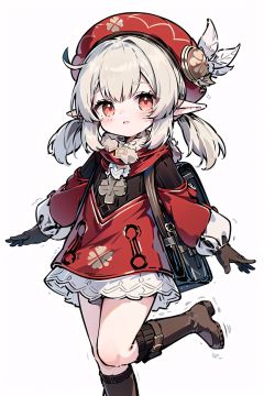 (8k, best quality, masterpiece), (ultra-detailed:1.1), (high detailed skin), full body, <lora:klee_v1:0.65:char>, kleedef, loli, child, barrel_skirt, beret, brown scarf, klee \(genshin impact\), leather_gloves, knee boots, pointy ears, brown footwear,school_bag,hat feather, low twintails, (white background, simple background:1.4), (black outline:1.2),