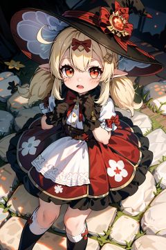 kleenew, loli, child, red_dress, witch hat, hair_clip,hair_ribbon,ribbon,black_gloves, twintails, bow, clover print, hat ornament, kneehighs, hair ornament , sidelocks,kleenew