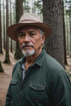 RAW photo, a portrait photo of 55 y.o man, traveler clothes, standing in the forest, natural skin, 8k uhd, high quality, film grain, Fujifilm XT3