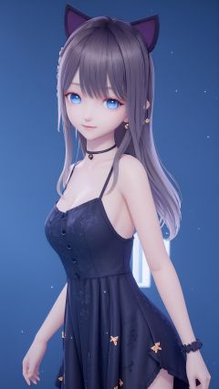 masterpiece,best quality,1girl, animal_ears, arms_behind_back, bangs, bare_shoulders, black_choker, black_dress, black_hair, blue_eyes, bow, breasts, cat_ears, choker, dress, earrings, jewelry, long_hair, looking_at_viewer, sleeveless, smile, solo, standing, simple background, <lora:lumi:0.8>