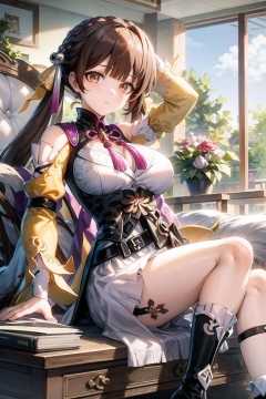 masterpiece, best quality, SushangV4, 1girl, solo, long hair, breasts, large breasts, hair ornament, long sleeves, dress, cleavage, bare shoulders, closed mouth, braid, chinese clothes, indoors, sitting, couch, window, arm behind head, arm up, <lora:SushangV4-10:1>
