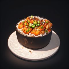 food, game icon institute, game icon,black background,simple background,plate,<lora:icon food-000038jiu:0.6>,Crispy chicken with peanuts in spicy sauce cube icon in traditional Sichuan cuisine style, rendered as a gorgeous game item asset.