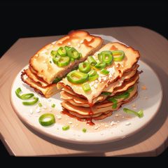 food, game icon institute, game icon,black background,simple background,plate,<lora:icon food-000038jiu:0.6>,jianbing pancake,crispy wonton and green onions,