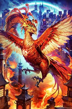 (Best quality),masterpiece,ultra high res,(photorealistic:1.4),Detailed face,perspective view,sky,town,city,solo,upper body,east asian architecture,sheath,architecture,halo,(no humans),(fenghuang),(phoenix),bird,flying,fire,midair,Birds flying through the air,a city surrounded by fire,Fractal Art,Fire energy,glowing,breathing fire,<lora:phoenix_v1.0:0.8>,