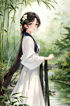 13 year old girl,white shirt,beauty,  (trees:0.5), (flowers:0.6) ,(birds:0.2), (bamboo0.1), lakes, Hangzhou,looking at viewer,