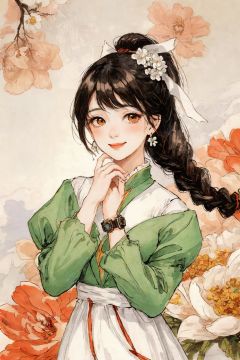 1girl, solo, braid, jewelry, blush, earrings, flower, bangs, floral print, looking at viewer, smile, long hair, long sleeves, floral background, upper body, dress, watch, bracelet, puffy sleeves, wristwatch, black hair, hair over shoulder, single braid, ribbon, white flower, hair ribbon, closed mouth, hand up, braided ponytail, chinese clothes, white dress, blue dress, hand on own chin, traditional media, brown hair