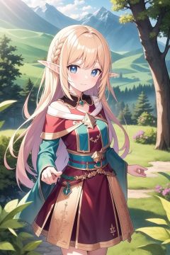 masterpiece,high quality,looking at viewer,magic girl,elf,forest,trees,mountain,