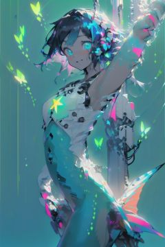 best quality,masterpiece,1girl,solo,Fish ear,Mermaid,(machine:1.1),(Mecha:1.1),(Mechanical fish tail:1.5),(Neon color:1.5),(Fluorescent color:1.5),(Fluorescent eye:1.1),(fin:1.2),(Fluorescent pink:1.3),(Saturation:1.5),(Laser violet:1.3),(Fluorescent Turquoise blue:1.3),(Mixed colored hair:1.2),(Human arm:1.8),(Special light effect:1.1),laser,(Butterfly:1.4),child,(The hanging fiber:1.7),(Starry background:2),(Shining star:1.5),