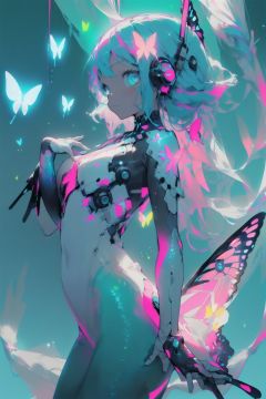 best quality,masterpiece,1girl,solo,Fish ear,Mermaid,(machine:1.1),(Mecha:1.1),(Mechanical fish tail:1.5),(Neon color:1.5),(Fluorescent color:1.5),(Fluorescent eye:1.1),(fin:1.2),(Fluorescent pink:1.3),(Saturation:1.5),(Laser violet:1.3),(Fluorescent Turquoise blue:1.3),(Mixed colored hair:1.2),(Human arm:1.6),(Special light effect:1.1),laser,(Butterfly:1.5),child,(The hanging fiber:1.7),(Starry background:1.8),