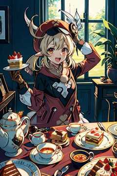 masterpiece, best quality, <lora:klee:1>,1girl, klee (genshin impact), food, cake, hat, red headwear, gloves, brown gloves, chair, pointy ears, clover print, teacup, cup, bangs, clock, long sleeves, cabbie hat, arm up, hair between eyes, ahoge, light brown hair, fruit, long hair, strawberry, table, solo, twintails, hat feather, fork, sidelocks, plate, low twintails, red coat, open mouth, holding, indoors, looking at viewer, sitting, hat ornament, dodoco (genshin impact), orange eyes, coat, bag, wall clock, teapot, scarf, cake slice, brown scarf, tea, backpack, holding fork, candle, bookshelf, spoon, saucer, window, strawberry shortcake, tiered tray, blonde hair, red eyes, :o, charm (object), jumpy dumpty, feathers, book, candlestand, :d, picture frame, cupcake, tablecloth, analog clock, birthday cake, smile