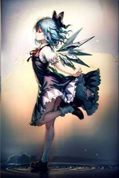 masterpiece, best quality, <lora:cirno:1>, <lora:lq:0.6>,lqstyle01,1girl, cirno, solo, wings, dress, bow, blue hair, closed eyes, short sleeves, ice, hair bow, ice wings, blue bow, blue dress, puffy sleeves, socks, short hair, white socks, puffy short sleeves, shoes, full body, black footwear, profile, standing on one leg, standing, light particles, chromatic aberration, black background, from side, white shirt, sparkle, leg up, shirt, reflection, closed mouth, simple background, short dress, light, bangs, bobby socks, mary janes, ribbon, breasts, bare legs, outstretched arms, smile, tiptoes