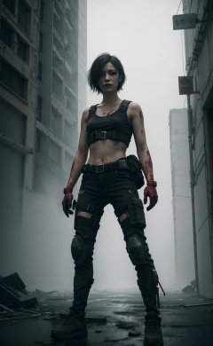 1girl, Gritty neon, synthetic textures, modded limbs, worn materials, atmospheric fog, rebellious stances, urban decay, layered storytelling, sci-fi tech, dystopian settings