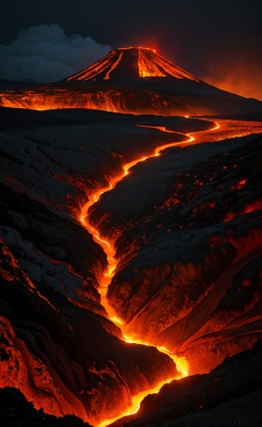 Spectacular, volcanic landscape, billowing smoke, fiery lava, molten rivers, glowing night, 9:16 vertical capture, apocalyptic scenery, award-winning image, Sony A7R IV, high dynamic range, dramatic contrast, dangerous beauty, inhospitable terrain, no life, otherworldly ambiance.