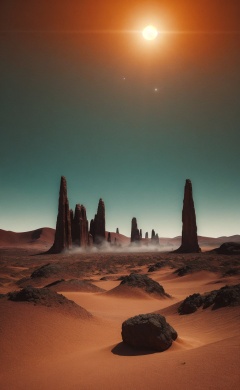 Alien desert, surreal landscape, bizarre rock formations, vivid sky, extraterrestrial plants, vivid hues, space exploration, 9:16 composition, Martian sunset, undulating dunes, peculiar shadows, towering spires, glowing crystals, swirling dust devils, unearthly beauty, remote horizon, stark contrasts, eerie tranquility