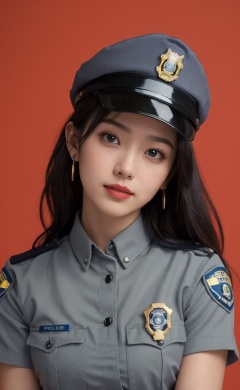 simple background,(Wearing a female police uniform and a police cap:1.4), good hand,4k, high-res, masterpiece, best quality, head:1.3,((Hasselblad photography)), finely detailed skin, sharp focus, (cinematic lighting), soft lighting, dynamic angle, [:(detailed face:1.2):0.2],midriff peek, medium breasts, breasts,(((inside mansion))),1girl, jewelry,earrings, orange_sky, solo, long_hair, upper body, grey eyes, looking at viewer,black hair,Fashion,(head tilt:1.4), red background, lips, slightly smile