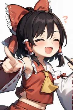 masterpiece, best quality, <lora:reimu:1>, chibi,1girl, solo, hakurei reimu, hair bow, bow, detached sleeves, closed eyes, hair tubes, open mouth, red bow, smile, brown hair, ascot, ^_^, blush, ponytail, simple background, :d, white background, bare shoulders, parody, \m/, upper body, pinky out, pointing, wide sleeves, long hair, ribbon, skirt set, shirt, laughing, hair ribbon, double \m/, happy, long sleeves, short hair, black hair, red skirt, skirt