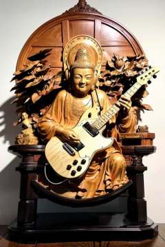 masterpiece, best quality,wood, statue,buddha,(holding guitar:1.2),(guitar:1.2), (headset:1.2),black background