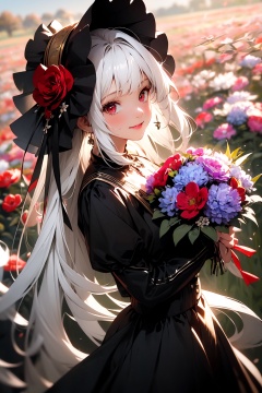 masterpiece, best quality, 1girl, solo, long_hair, looking_at_viewer, white hair, red eyes, smile, bangs, skirt, shirt, long_sleeves, hat, dress, bow, holding, closed_mouth, flower, frills, hair_flower, petals, bouquet, holding_flower, center_frills, bonnet, holding_bouquet, flower field, flower field, colorful, vivid color, blue sky, lens flare, depth of field, dutch angle